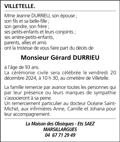Cet espace « condoléances » est dédié à la mémoire de Monsieur Gérard DURRIEU.