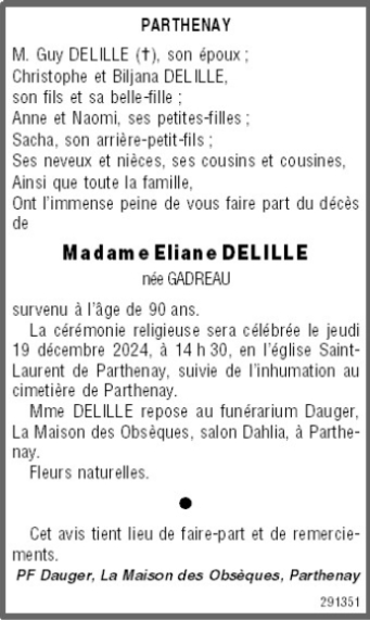Cet espace « condoléances » est dédié à la mémoire de Madame Eliane DELILLE née GADREAU.
