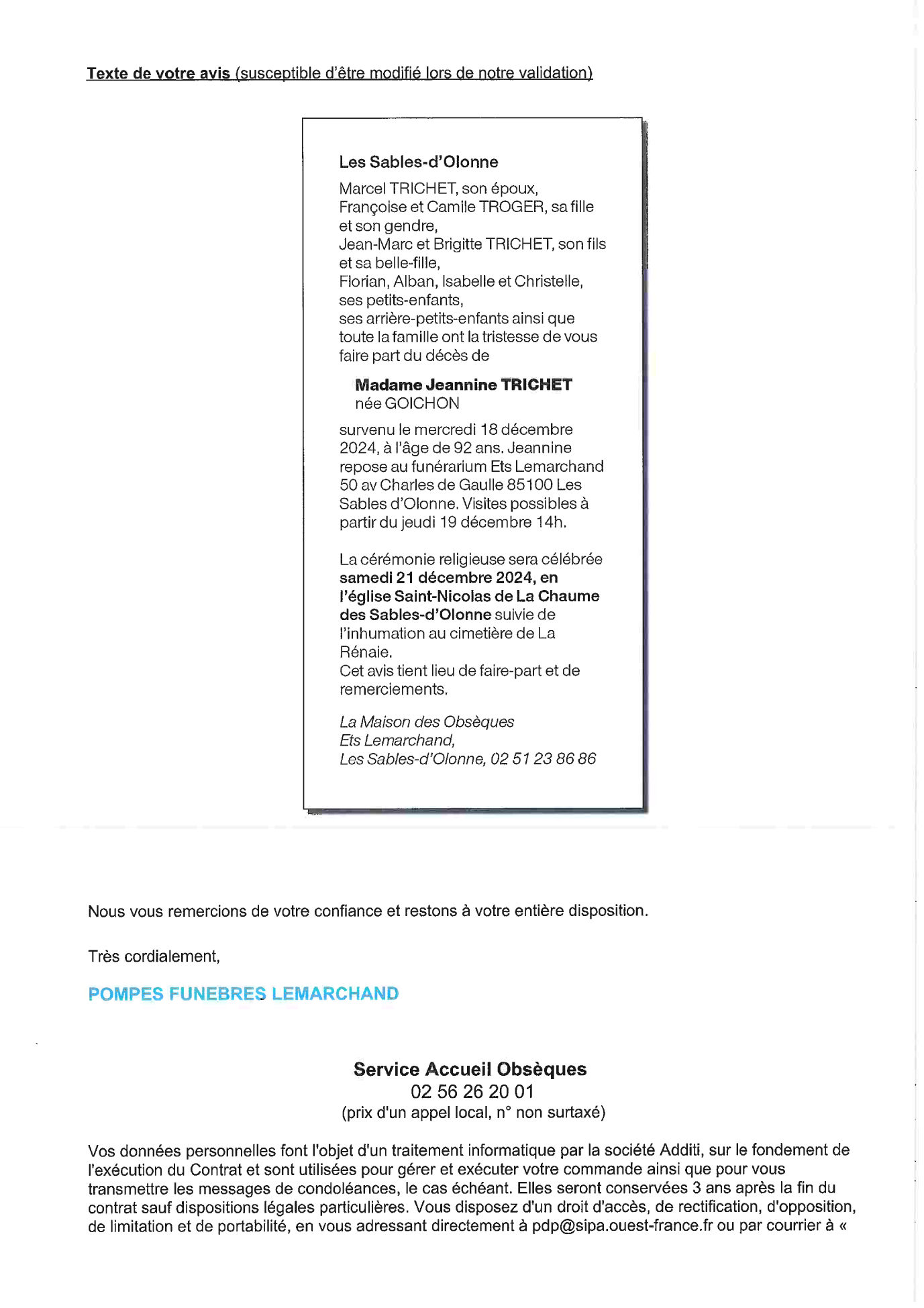 Cet espace « condoléances » est dédié à la mémoire de Madame Jeanine TRICHET née GOICHON.