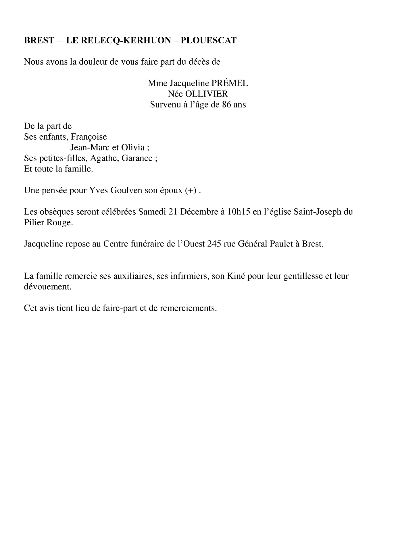 Cet espace « condoléances » est dédié à la mémoire de Madame Jacqueline Prémel née OLLIVIER.