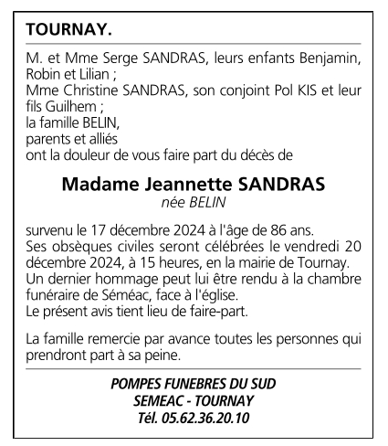 Cet espace « condoléances » est dédié à la mémoire de Madame Jeanne SANDRAS née BELIN.