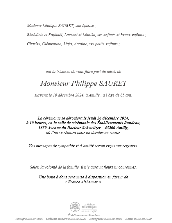 Cet espace « condoléances » est dédié à la mémoire de Monsieur Philippe SAURET.