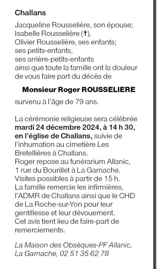 Décédé à Challans (85300) le vendredi 20 décembre 2024