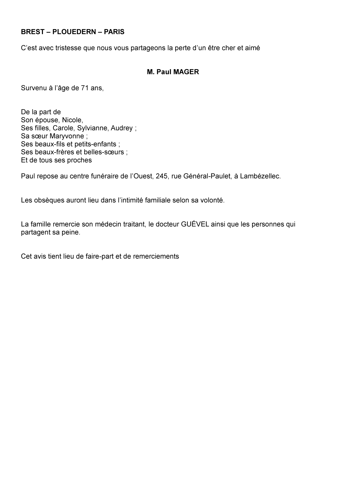 Cet espace « condoléances » est dédié à la mémoire de Monsieur Paul MAGER.