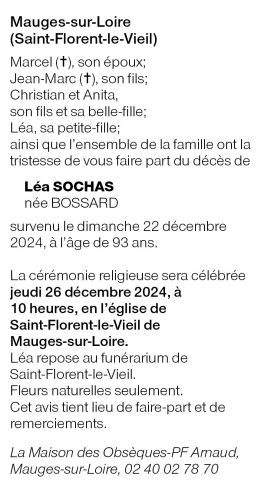 Cet espace « condoléances » est dédié à la mémoire de Madame Léa SOCHAS née BOSSARD.