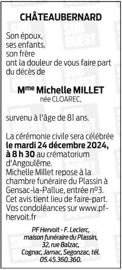 de Madame Michelle MILLET née CLOAREC