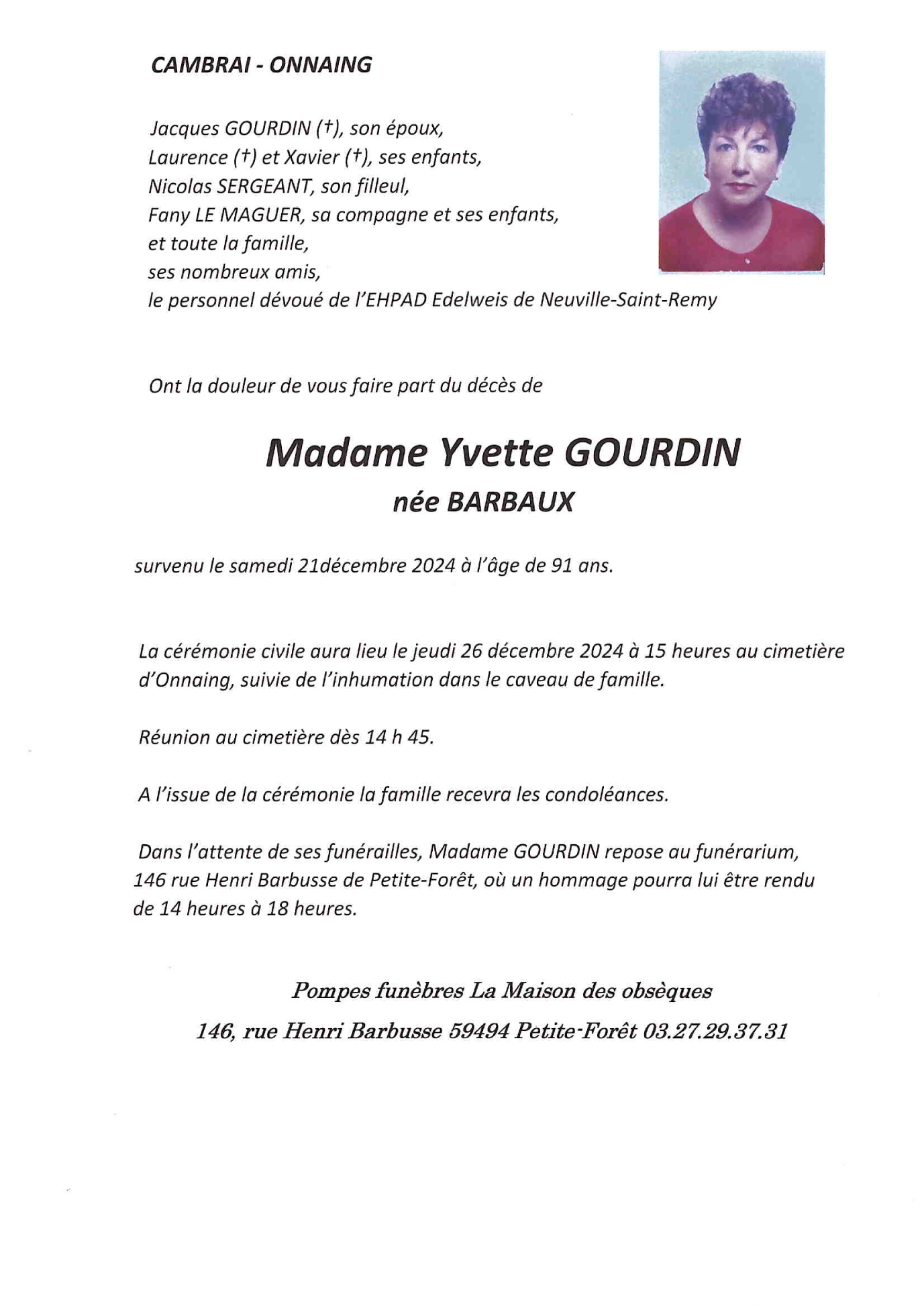 Cet espace « condoléances » est dédié à la mémoire de Madame Yvette GOURDIN née BARBAUX.
