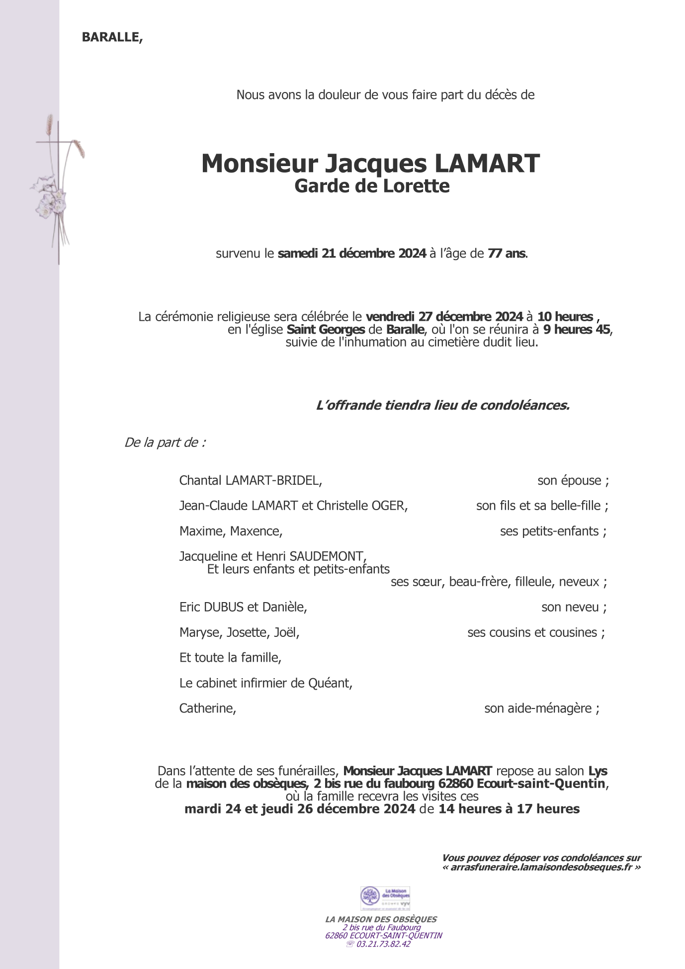Cet espace « condoléances » est dédié à la mémoire de Monsieur Jacques LAMART.
