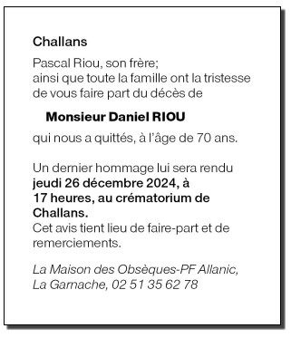Cet espace « condoléances » est dédié à la mémoire de Monsieur Daniel RIOU.