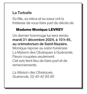 Cet espace « condoléances » est dédié à la mémoire de Madame Monique LEVREY née ENTREMONT.