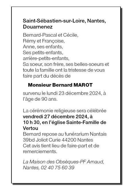 Décédé à Vertou (44120) le lundi 23 décembre 2024