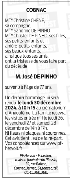 Cet espace « condoléances » est dédié à la mémoire de Monsieur José DE PINHO.