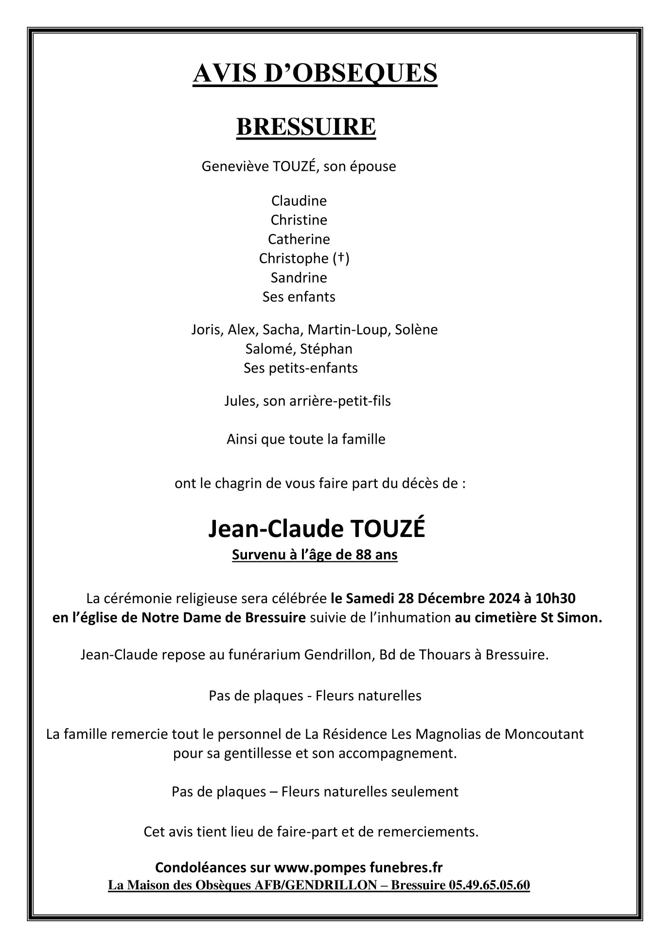 Cet espace « condoléances » est dédié à la mémoire de Monsieur Jean-Claude TOUZE.