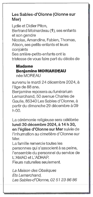 Cet espace « condoléances » est dédié à la mémoire de Madame Benjamine MOINARDEAU née MOREAU.
