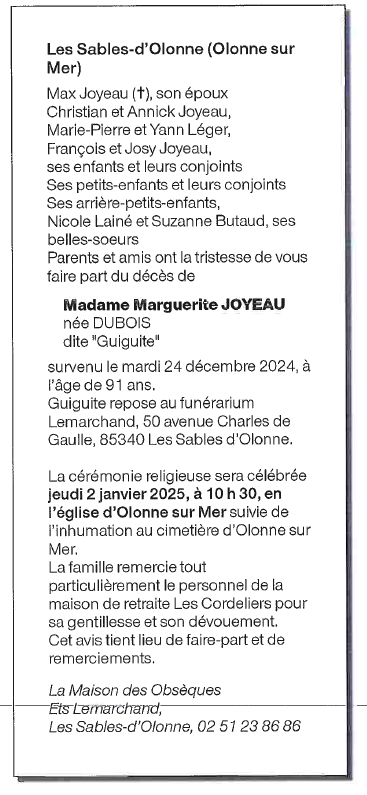 de Madame Marguerite JOYEAU née DUBOIS