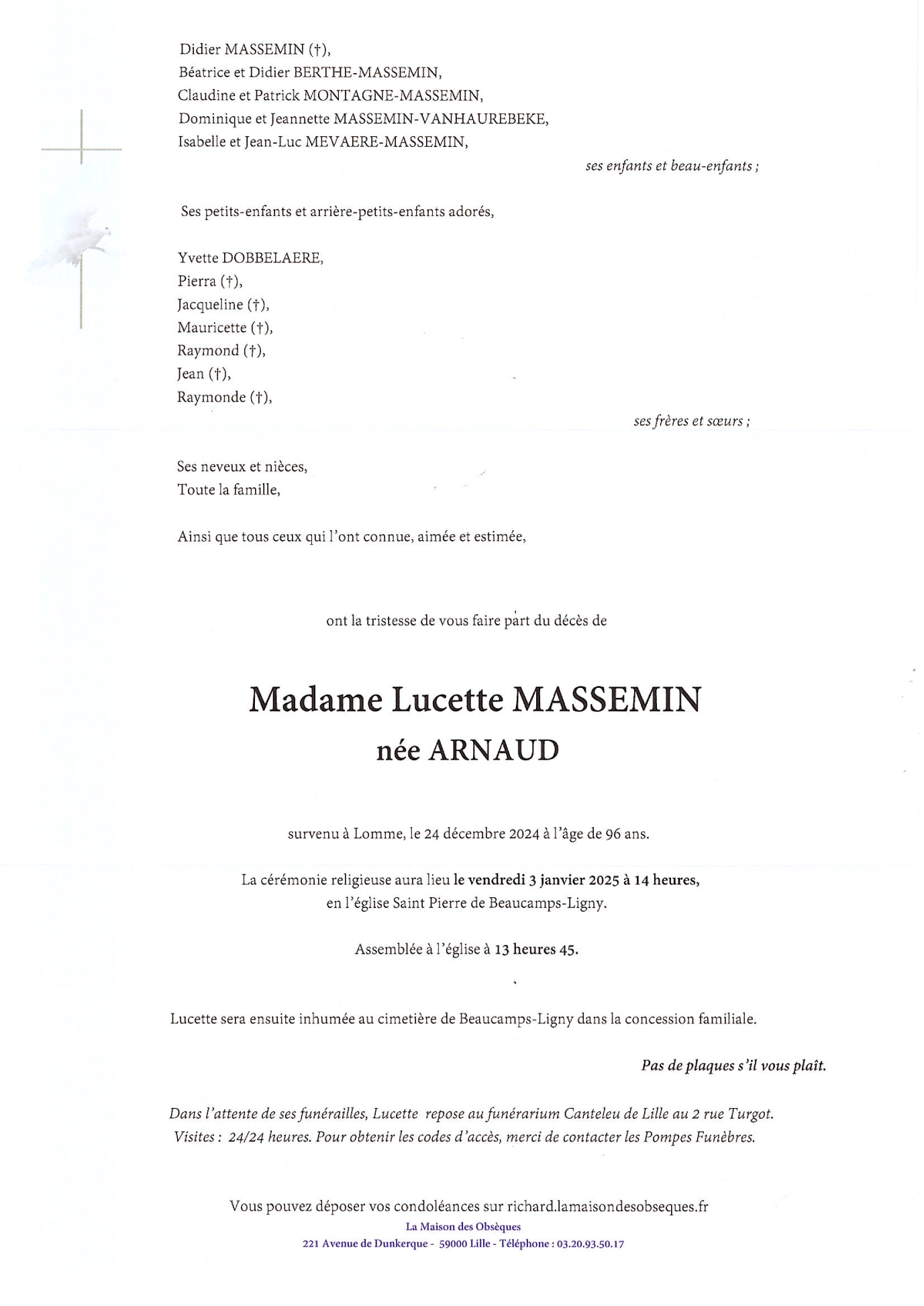 Cet espace « condoléances » est dédié à la mémoire de Madame Lucette née ARNAUD.