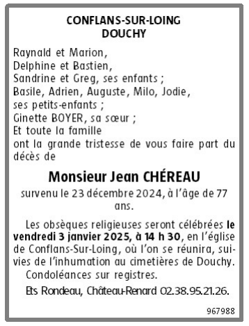 Cet espace « condoléances » est dédié à la mémoire de Monsieur Jean CHÉREAU.