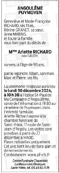 Cet espace « condoléances » est dédié à la mémoire de Madame Arlette RICHARD née GAUDY.