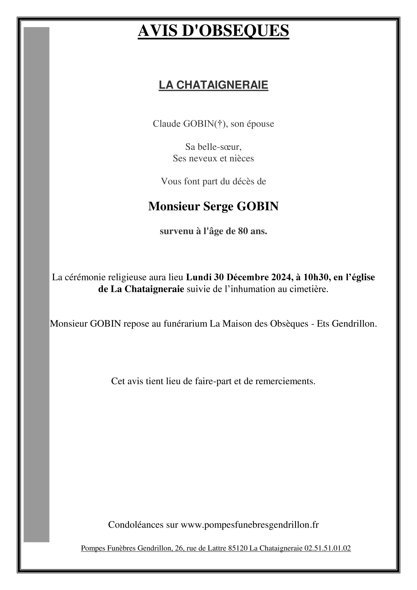 Cet espace « condoléances » est dédié à la mémoire de Monsieur Serge GOBIN.