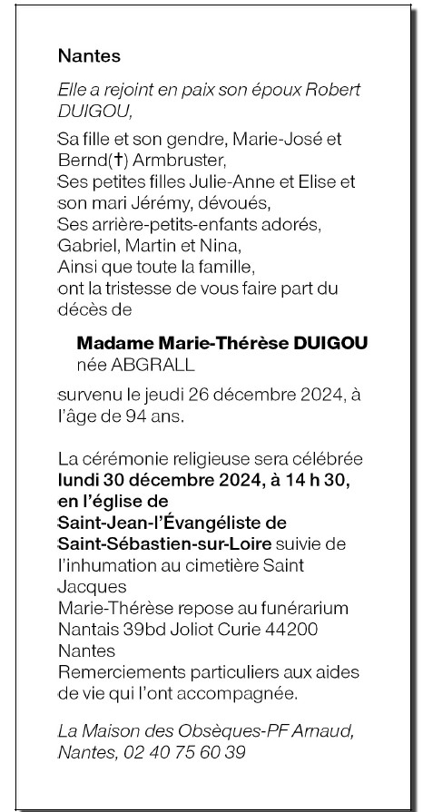 de Madame Marie-Thérèse DUIGOU née ABGRALL