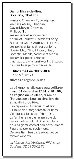 Cet espace « condoléances » est dédié à la mémoire de Madame Léa CHEVRIER née MÉRIEAU.