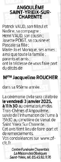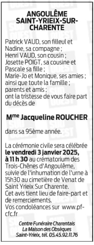 Cet espace « condoléances » est dédié à la mémoire de Madame JACQUELINE ROUCHER.