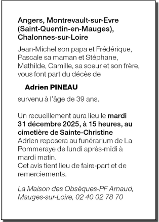 Décédé à Angers (49000) le jeudi 26 décembre 2024