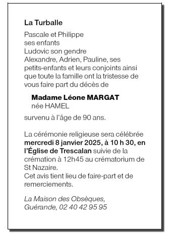 Cet espace « condoléances » est dédié à la mémoire de Madame Léone MARGAT née HAMEL.