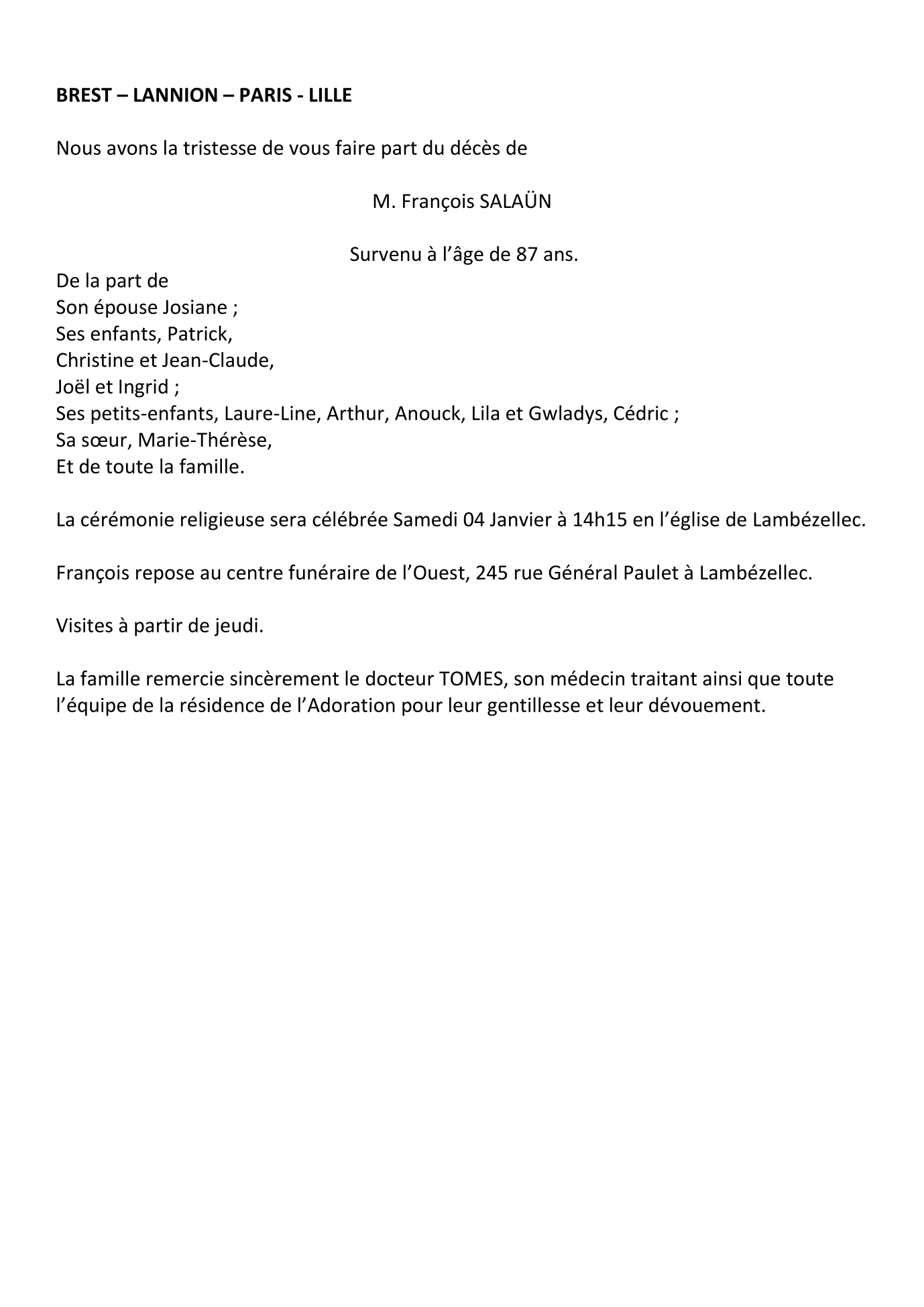 Cet espace « condoléances » est dédié à la mémoire de Monsieur François SALAÜN.