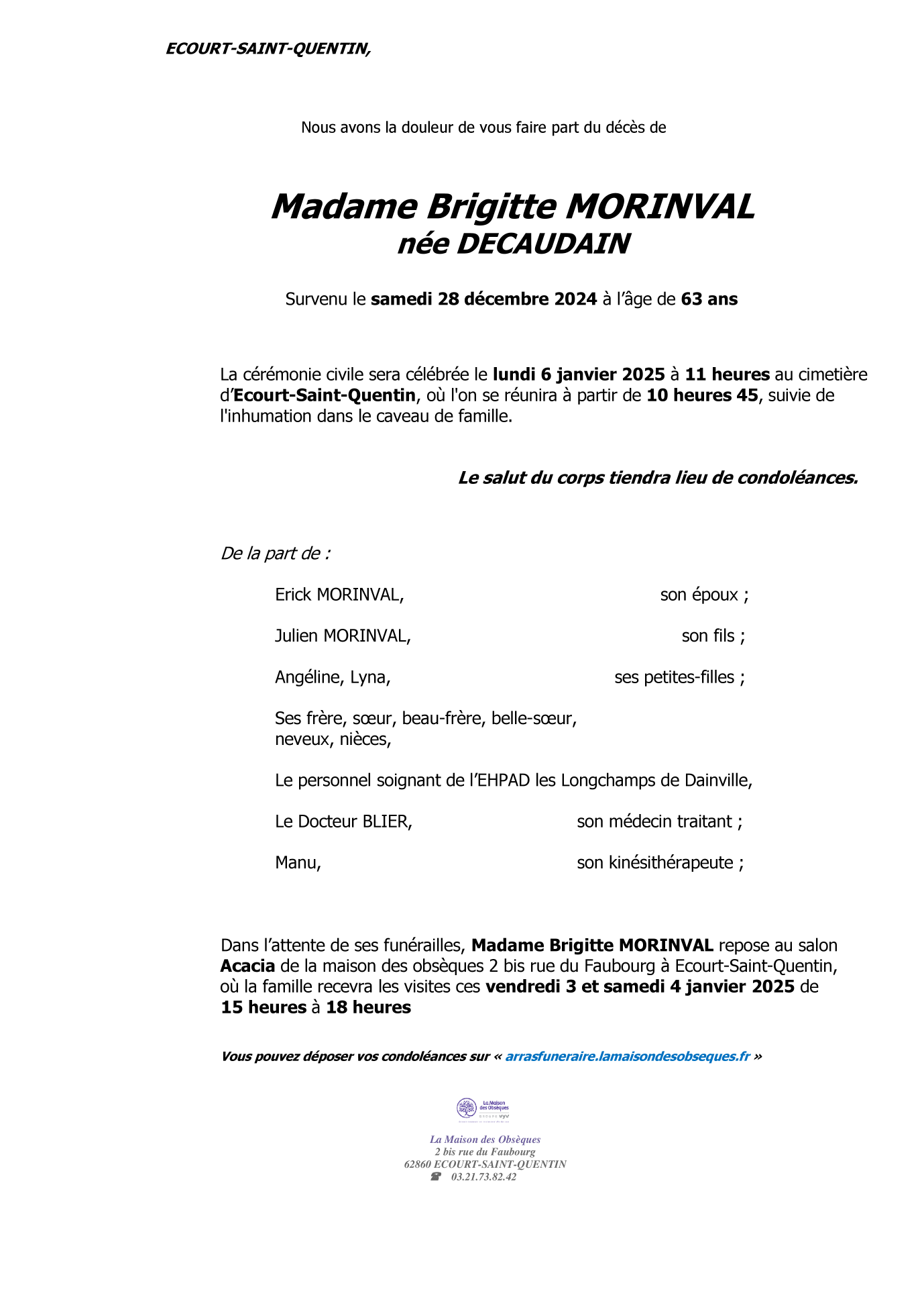 de Madame Brigitte MORINVAL née DECAUDAIN
