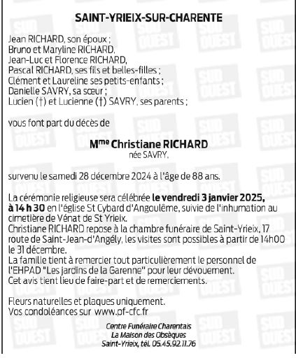 Cet espace « condoléances » est dédié à la mémoire de Madame Christiane RICHARD née SAVRY.
