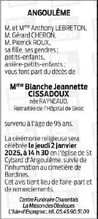 Cet espace « condoléances » est dédié à la mémoire de Madame BLANCHE CISSADOUX née RAYNEAUD.