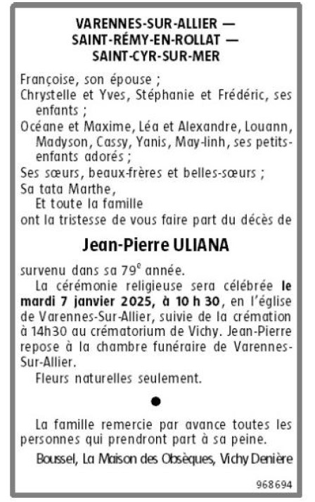 Cet espace « condoléances » est dédié à la mémoire de Monsieur Jean ULIANA.