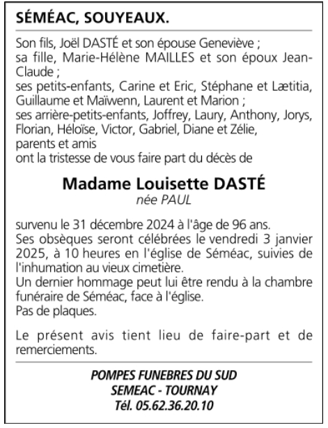 Cet espace « condoléances » est dédié à la mémoire de Madame Louisette DASTÉ née PAUL.