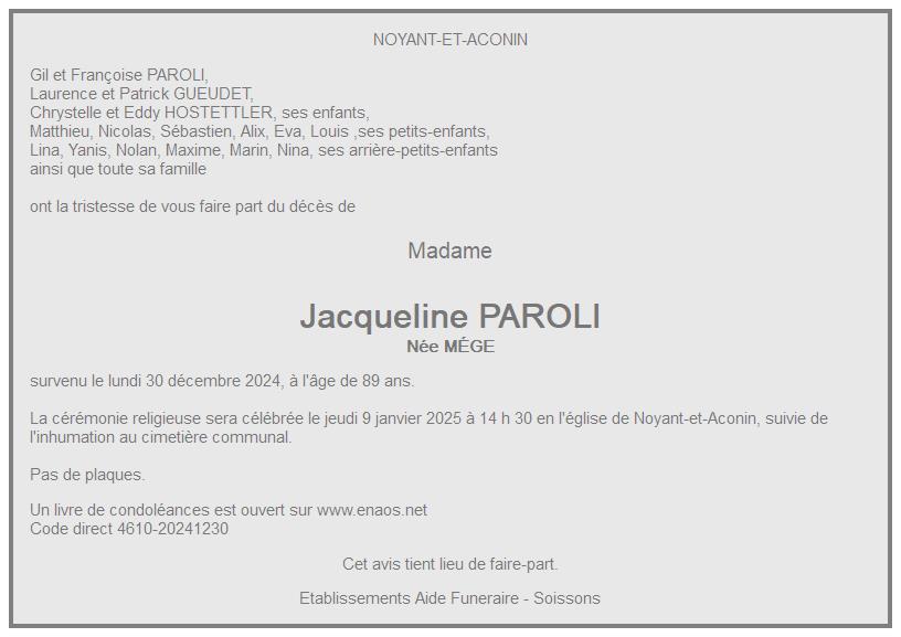de Madame Jacqueline PAROLI née MÉGE