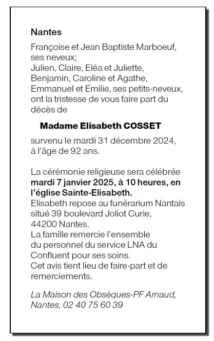 Cet espace « condoléances » est dédié à la mémoire de Madame Elisabeth COSSET.