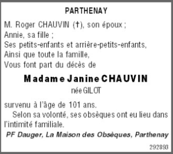 Cet espace « condoléances » est dédié à la mémoire de Madame Janine CHAUVIN née GILOT.