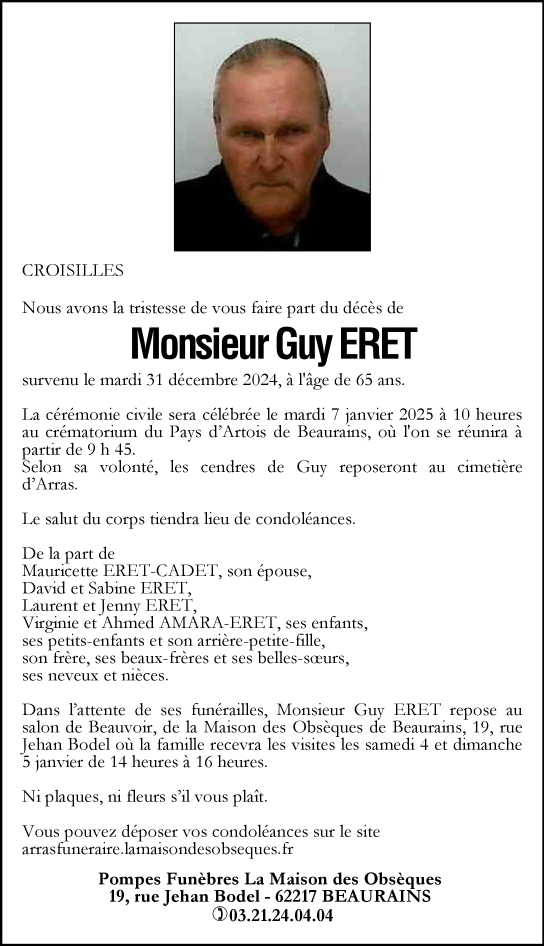 Cet espace « condoléances » est dédié à la mémoire de Monsieur Guy ERET.