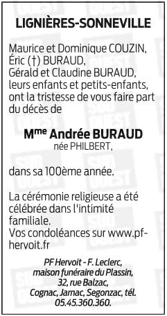 Cet espace « condoléances » est dédié à la mémoire de Madame Andrée BURAUD née PHILBERT.