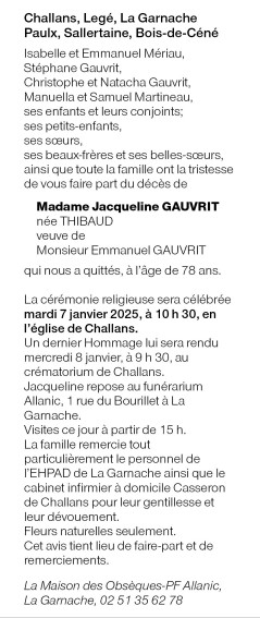 de Madame Jacqueline GAUVRIT née THIBAUD