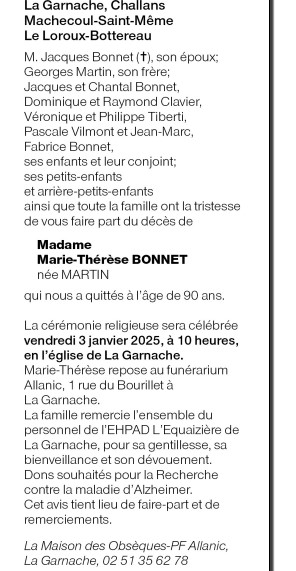 Cet espace « condoléances » est dédié à la mémoire de Madame Marie-Thérèse BONNET née MARTIN.