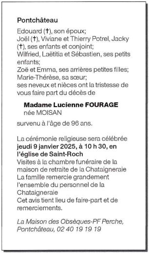 de Madame LUCIENNE FOURAGE née MOISAN