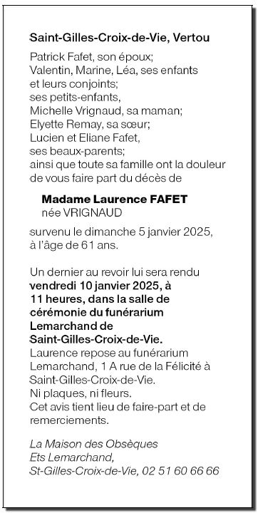 Cet espace « condoléances » est dédié à la mémoire de Madame Laurence FAFET née VRIGNAUD.