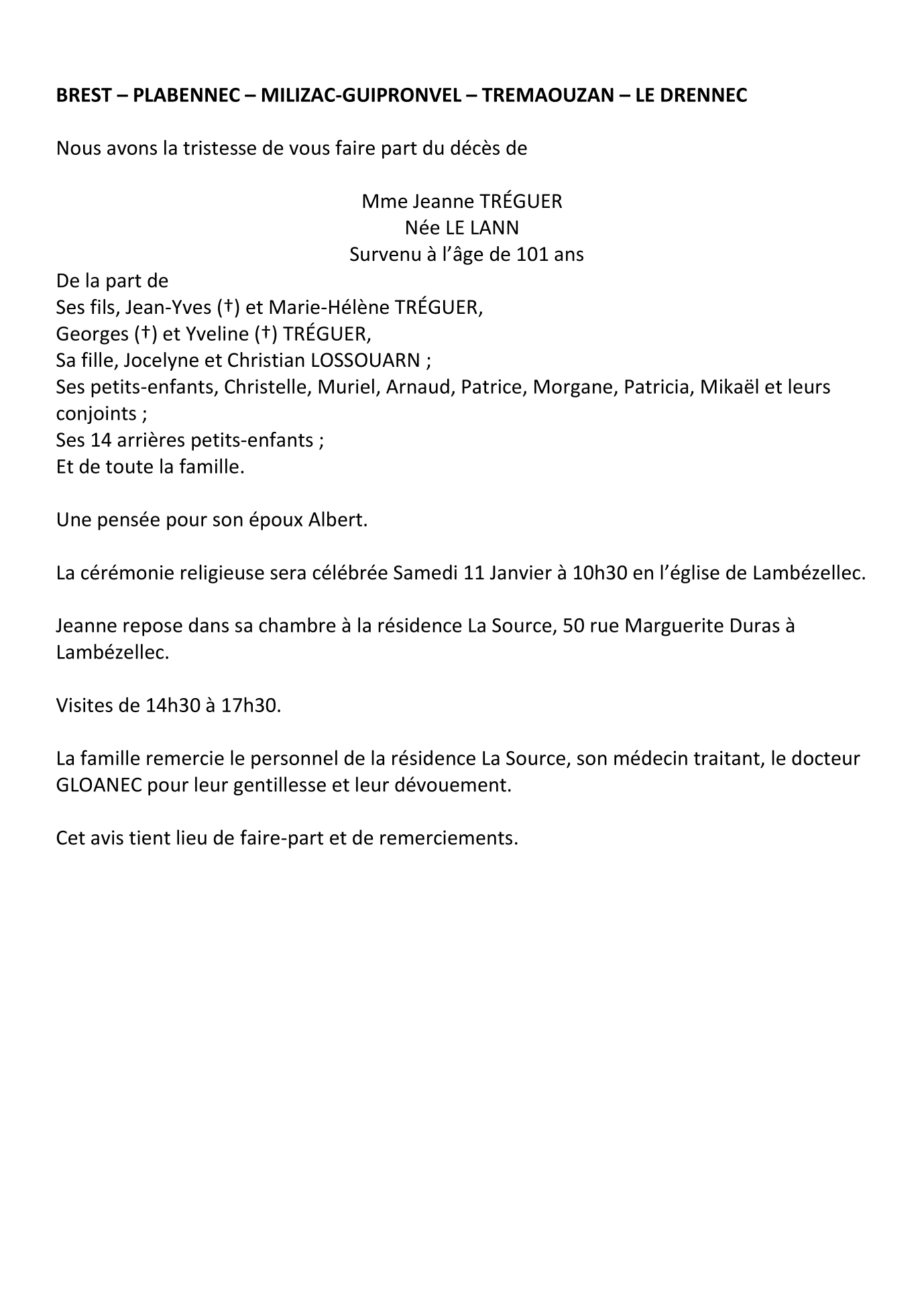 Cet espace « condoléances » est dédié à la mémoire de Madame Jeanne TRÉGUER née LE LANN.