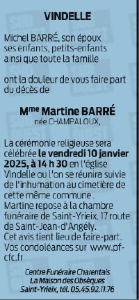 Cet espace « condoléances » est dédié à la mémoire de Madame Martine BARRÉ née CHAMPALOUX.