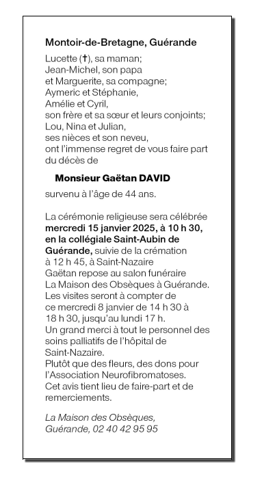 Cet espace « condoléances » est dédié à la mémoire de Monsieur GAËTAN DAVID.