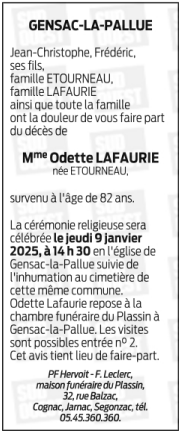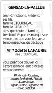 Cet espace « condoléances » est dédié à la mémoire de Madame Odette LAFAURIE née ETOURNEAU.