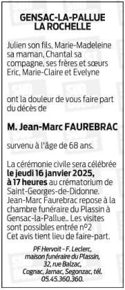 Cet espace « condoléances » est dédié à la mémoire de Monsieur Jean-Marc FAUREBRAC.