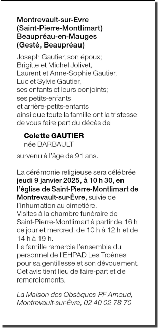 Cet espace « condoléances » est dédié à la mémoire de Madame Colette GAUTIER née BARBAULT.