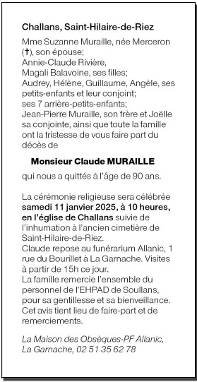 Décédé à Soullans (85300) le lundi 6 janvier 2025